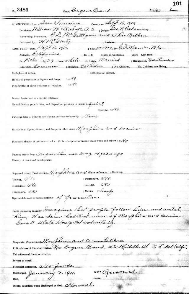 On 16 Sep 1910 he was admitted to Mendocino State Hospital